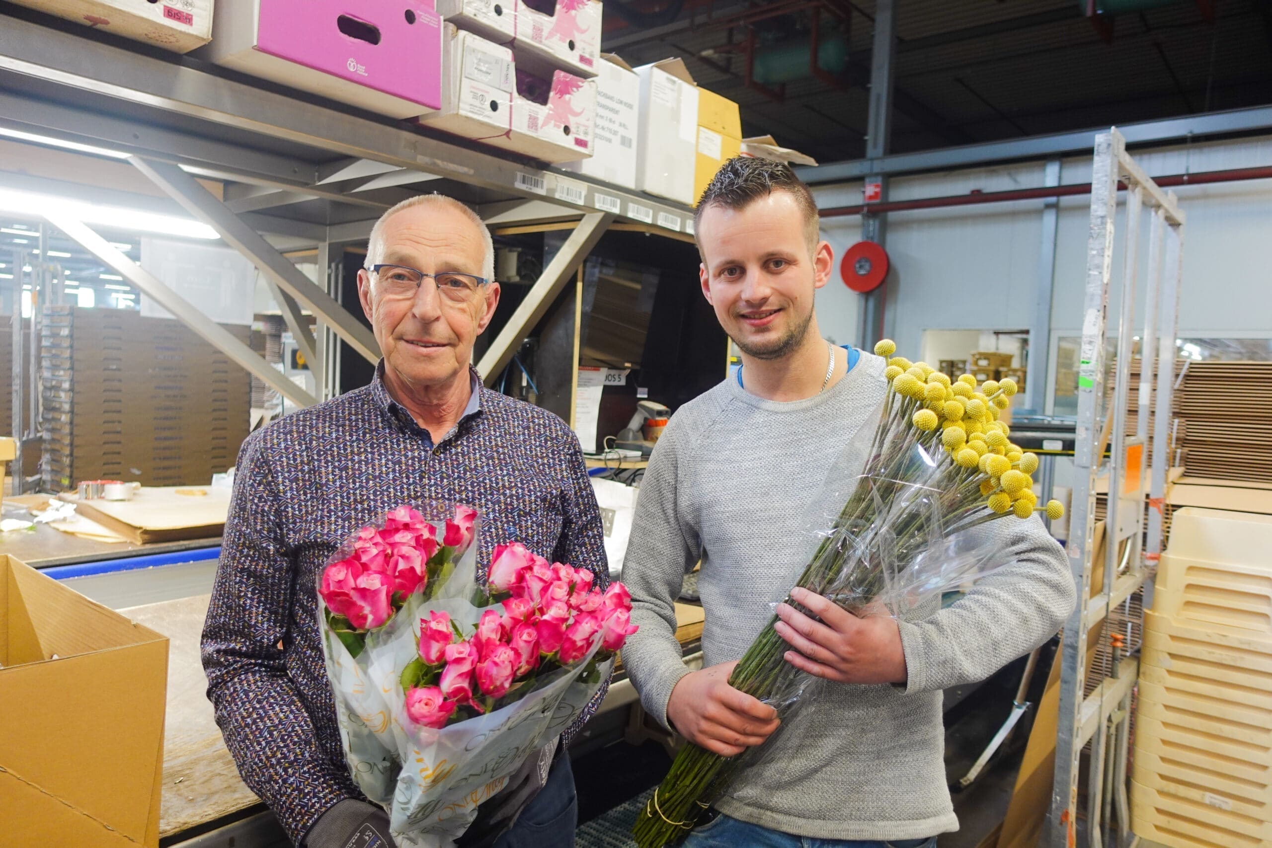 Bert Lindhout (72 ans) et Gert Guijt (30 ans) travaillent tous deux à la production chez Van der Plas. Ils travaillent en équipe pour que les fleurs parviennent au client de la meilleure façon possible.